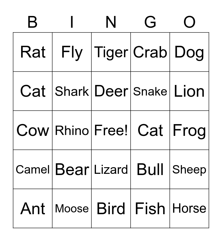 This bingo card has a free space and 24 words: Bear, Moose, Deer, Ant, Dog, Rat, Cat, Fly, Cat, Lizard, Snake, Cow, Bull, Sheep, Shark, Fish, Frog, Tiger, Lion, Rhino, Horse, Camel, Crab and Bird.