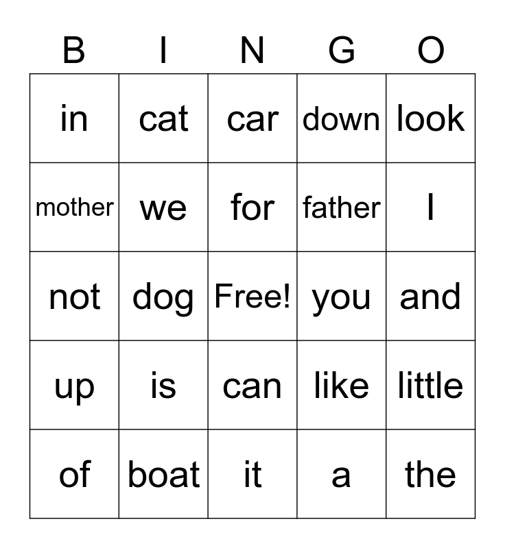 This bingo card has a free space and 30 words: boat, said, dog, ball, in, car, we, can, you, it, and, the, a, to, I, go, like, up, is, look, not, see, cat, father, mother, down, little, of, for and house.