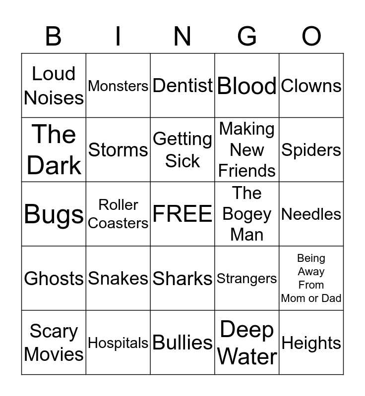 This bingo card has a free space and 24 words: Snakes, Hospitals, Getting Sick, Scary Movies, Clowns, Loud Noises, The Dark, Monsters, The Bogey Man, Sharks, Making New Friends, Bugs, Strangers, Being Away From Mom or Dad, Storms, Deep Water, Needles, Dentist, Spiders, Roller Coasters, Heights, Ghosts, Blood and Bullies.