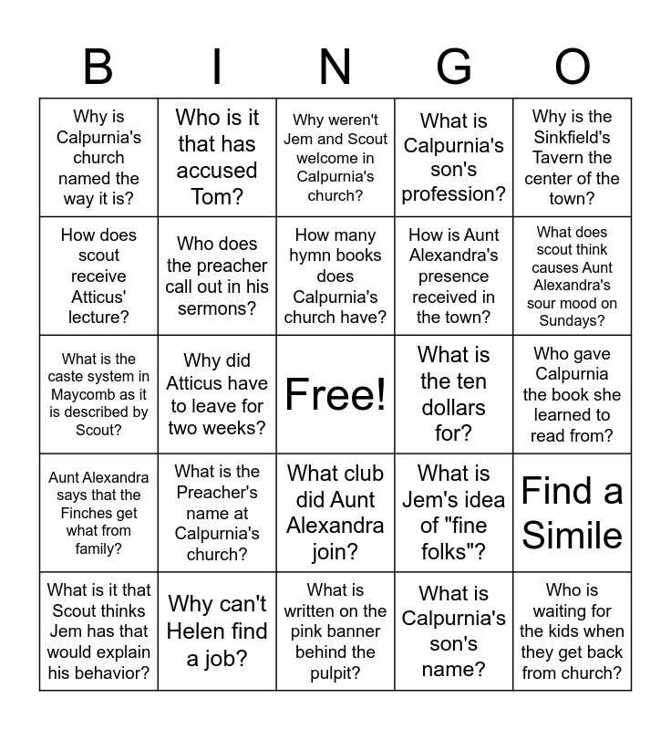 This bingo card has a free space and 29 words: What is it that Scout thinks Jem has that would explain his behavior?, Why is Dill not coming this summer?, Why did Atticus have to leave for two weeks?, What is the name of Calpurnia's church?, Why is Calpurnia's church named the way it is?, Why weren't Jem and Scout welcome in Calpurnia's church?, Who does the preacher call out in his sermons?, What is the Preacher's name at Calpurnia's church?, What is the ten dollars for?, Why can't Helen find a job?, Who gave Calpurnia the book she learned to read from?, Who is waiting for the kids when they get back from church?, What is written on the pink banner behind the pulpit?, What is Calpurnia's son's name?, What does scout think causes Aunt Alexandra's sour mood on Sundays?, Why does scout think Aunt Alexandra has come to stay with them?, What club did Aunt Alexandra join?, Aunt Alexandra says that the Finches get what from family?, Why is the Sinkfield's Tavern the center of the town?, What is the caste system in Maycomb as it is described by Scout?, What is Jem's idea of "fine folks"?, What is the real reason Aunt Alexandra has come to stay?, How is Aunt Alexandra's presence received in the town?, How does scout receive Atticus' lecture?, What is Calpurnia's son's profession?, Who is it that has accused Tom?, Find a Simile, How many hymn books does Calpurnia's church have? and What can't happen until the congregation comes up with 10 dollars?.
