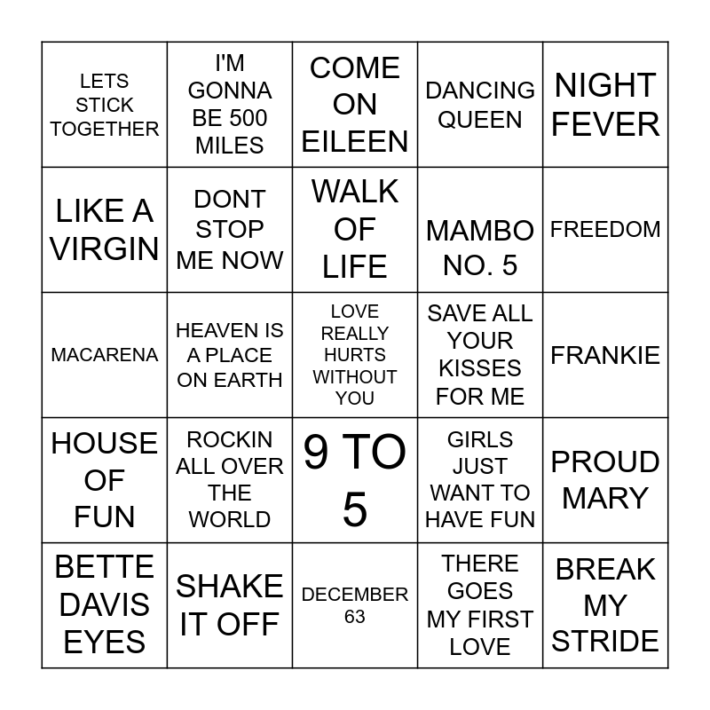 This bingo card has 55 words: AMERICAN PIE, BETTE DAVIS EYES, BROWN EYED GIRL, LETS STICK TOGETHER, DECEMBER 63, DONT STOP BELIEVEN, DONT STOP ME NOW, HEY BABY, MAMBO NO. 5, THE KETCHUP SONG, DANCING QUEEN, 2 TIMES, LOVESHACK, YES SIR I CAN BOOGIE, YOUR MY FIRST MY LAST MY EVERYTHING, BYE BYE BABY, NIGHT FEVER, HEAVEN IS A PLACE ON EARTH, UPTOWN GIRL, LOVE REALLY HURTS WITHOUT YOU, SAVE ALL YOUR KISSES FOR ME, LETS TWIST AGAIN, GIRLS JUST WANT TO HAVE FUN, COME ON EILEEN, CHAIN REACTION, WALK OF LIFE, THERE GOES MY FIRST LOVE, CROCODILE ROCK, FRANKIE, PROUD MARY, YOUR SUCH A GOOD LOOKING WOMAN, LOVE IS IN THE AIR, GREASED LIGHTNIN, WALKING ON SUNSHINE, LIKE A VIRGIN, MACARENA, LA BAMBA, HOUSE OF FUN, BREAK MY STRIDE, ALL ABOUT THAT BASS, I'M GONNA BE 500 MILES, COTTON EYED JOE, BABY JANE, REACH, ROCKIN ALL OVER THE WORLD, SHAKE IT OFF, VOULEZ VOUS, VALERIE, MICKEY, FREEDOM, WE LIKE TO PARTY, SATURDAY NIGHT, RIDE ON TIME, 9 TO 5 and UPTOWN FUNK.
