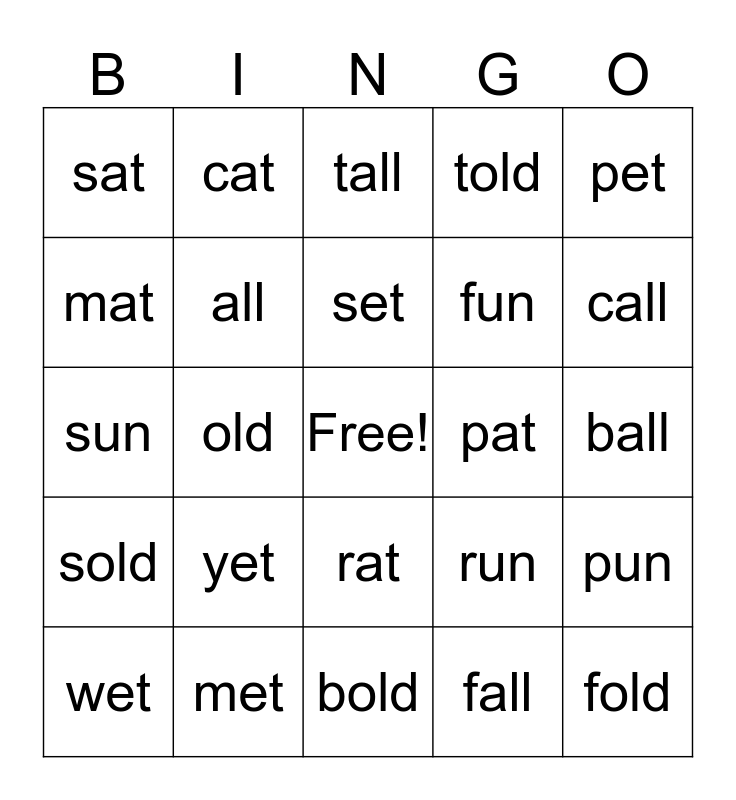 This bingo card has a free space and 24 words: yet, met, set, wet, pet, sat, mat, cat, pat, rat, fun, sun, run, pun, all, fall, ball, tall, call, old, fold, sold, told and bold.