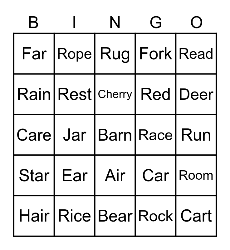 This bingo card has a free space and 24 words: Ear, Rice, Cherry, Hair, Read, Far, Rain, Rope, Race, Air, Red, Care, Car, Room, Rest, Rock, Run, Rug, Deer, Jar, Cart, Star, Fork and Bear.