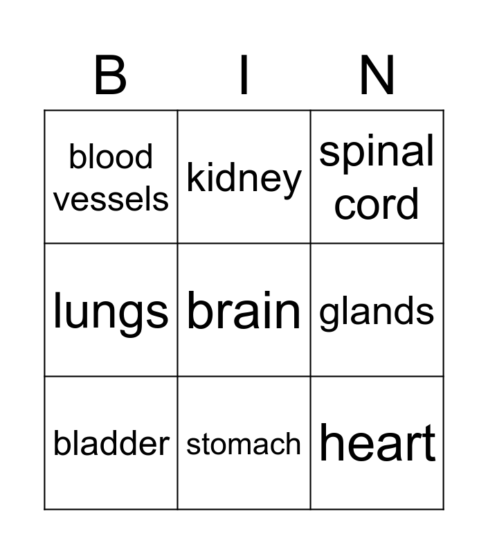 This bingo card has 15 words: Hair, Lymph nodes, spinal cord, blood vessels, stomach, brain, spleen, muscles, glands, heart, Skin, lungs, bladder, kidney and bones.