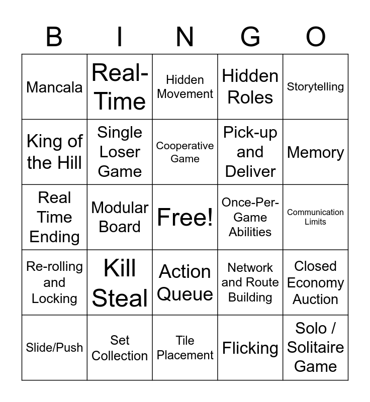This bingo card has a free space and 88 words: Acting, Action Points, Action Queue, Action Timer, Alliances, Area Majority / Influence, Area Movement, Auction/Bidding, Automatic Resource Growth, Betting and Bluffing, Chit-Pull System, Closed Drafting, Closed Economy Auction, Communication Limits, Contracts, Cooperative Game, Cube Tower, Deck Construction, Deck, Bag, and Pool Building, Deduction, Dice Rolling, Drawing, Real Time Ending, End Game Bonuses, Flicking, Follow, Grid Coverage, Grid Movement, Hand Management, Hexagon Grid, Hidden Movement, Hidden Roles, Hidden Victory Points, I Cut, You Choose, Kill Steal, King of the Hill, Mancala, Matching, Melding and Splaying, Memory, Modular Board, Multi-Use Cards, Negotiation, Network and Route Building, Once-Per-Game Abilities, Open Drafting, Paper-and-Pencil, Pattern Building, Pattern Recognition, Pick-up and Deliver, Player Elimination, Player Judge, Programmed Movement, Push Your Luck, Race, Random Production, Re-rolling and Locking, Real-Time, Rock-Paper-Scissors, Roll / Spin and Move, Rondel, Score-and-Reset Game, Secret Unit Deployment, Selection Order Bid, Semi-Cooperative Game, Set Collection, Simultaneous Action Selection, Single Loser Game, Slide/Push, Solo / Solitaire Game, Speed Matching, Square Grid, Stacking and Balancing, Storytelling, Take That, Team-Based Game, Tech Trees / Tech Tracks, Three-Dimensional Movement, Tile Placement, Trading, Traitor Game, Trick-taking, Tug of War, Variable Player Powers, Variable Set-up, Victory Points as a Resource, Voting and Worker Placement.