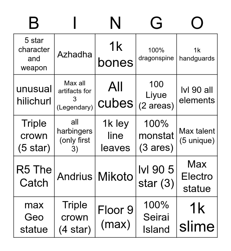 This bingo card has 25 words: Andrius, Floor 9 (max), All cubes, max Geo statue, 1k handguards, 5 star character and weapon, unusual hilichurl, Azhadha, 100% monstat (3 ares), Mikoto, 100 Liyue (2 areas), Triple crown (5 star), lvl 90 5 star (3), Max Electro statue, Max all artifacts for 3 (Legendary), 1k slime, Max talent (5 unique), 1k bones, lvl 90 all elements, all harbingers (only first 3), 1k ley line leaves, Triple crown (4 star), R5 The Catch, 100% dragonspine and 100% Seirai Island.