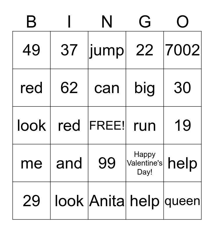 This bingo card has a free space and 24 words: and, look, can, 29, 7002, 49, red, 37, run, 99, big, look, Happy Valentine's Day!, help, 62, help, 19, jump, 30, red, queen, me, 22 and Anita.