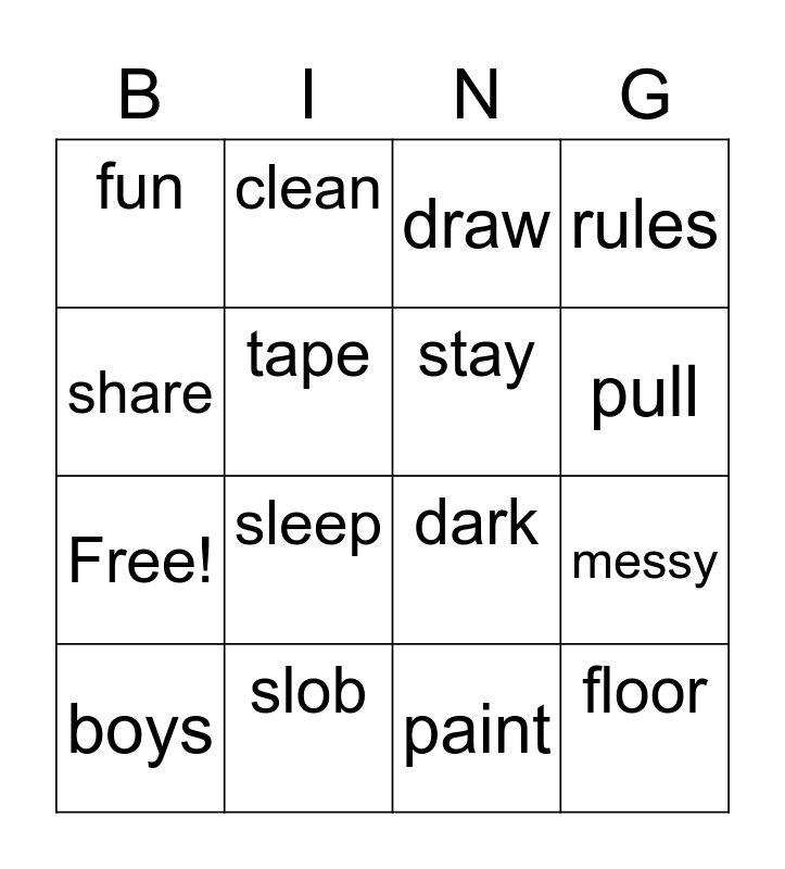 This bingo card has 20 words: messy, neat, draw, organize, boys, share, slob, fun, Free!, clean, sleep, dark, tape, floor, stay, cross, pull, rules, paint and they.