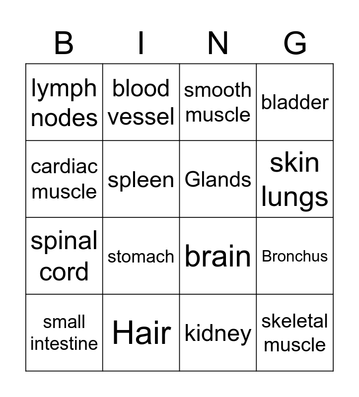 This bingo card has 20 words: Bronchus, Joint, smooth muscle, large intestine, small intestine, cardiac muscle, Hair, lymph nodes, spinal cord, blood vessel, stomach, brain, spleen, skeletal muscle, Glands, heart, skin lungs, bladder, kidney and bones.