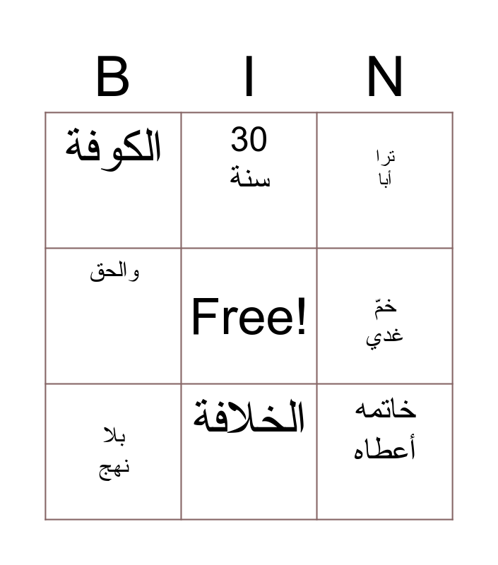 This bingo card has a free space and 8 words: خمّ غدي, ترا أبا, 30 سنة, بلا نهج, الكوفة, خاتمه أعطاه, والحق and الخلافة.