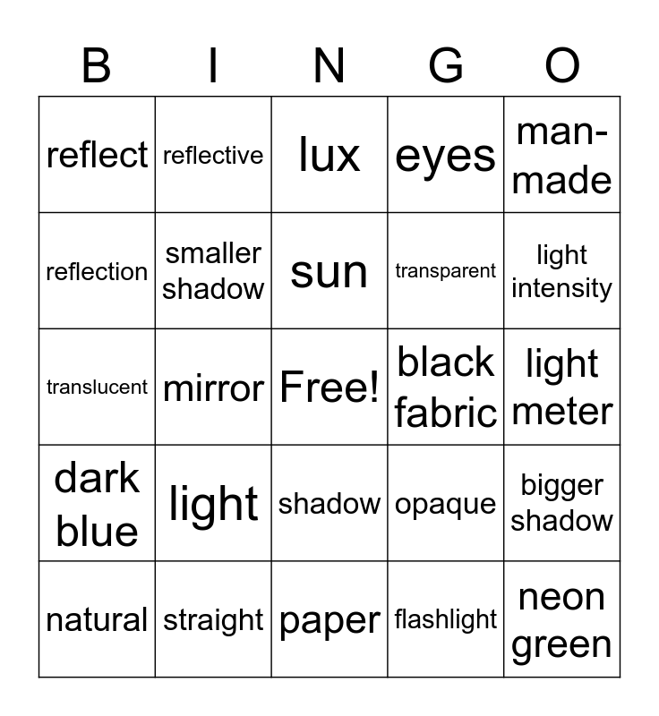 This bingo card has a free space and 24 words: light, straight, sun, natural, man-made, reflect, reflection, reflective, black fabric, shadow, transparent, translucent, opaque, bigger shadow, smaller shadow, flashlight, light meter, lux, light intensity, mirror, neon green, dark blue, eyes and paper.