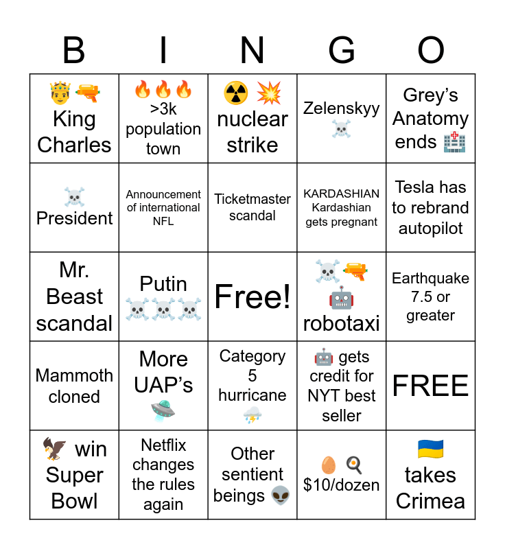 This bingo card has a free space and 26 words: Category 5 hurricane βοΈ, π₯ π³ $10/dozen, Ticketmaster scandal, Netflix changes the rules again, Greyβs Anatomy ends π₯, π€΄π« King Charles, β οΈ President, π₯π₯π₯ >3k population town, Earthquake 7.5 or greater, π€ gets credit for NYT best seller, KARDASHIAN Kardashian gets pregnant, Mr. Beast scandal, FREE, π¦ win Super Bowl, Putin β οΈβ οΈβ οΈ, Tom Brady π, Zelenskyy β οΈ, Mammoth cloned, β’οΈ π₯ nuclear strike, πΊπ¦ takes Crimea, Tesla has to rebrand autopilot, Other sentient beings π½, β οΈπ«π€ robotaxi, More UAPβs πΈ, Announcement of international NFL and Bigfoot.