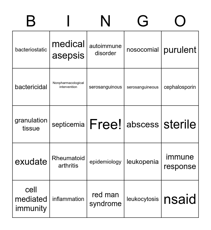 This bingo card has a free space and 26 words: epidemiology, leukocytosis, serosanguinous, inflammation, purulent, bacteriostatic, bactericidal, medical asepsis, sterile, leukopenia, serosanguineous, granulation tissue, immune response, cell mediated immunity, septicemia, cellulitis, nosocomial, exudate, autoimmune disorder, nsaid, cephalosporin, red man syndrome, abscess, Rheumatoid arthritis, Nonpharmacological intervention and Prednisone.