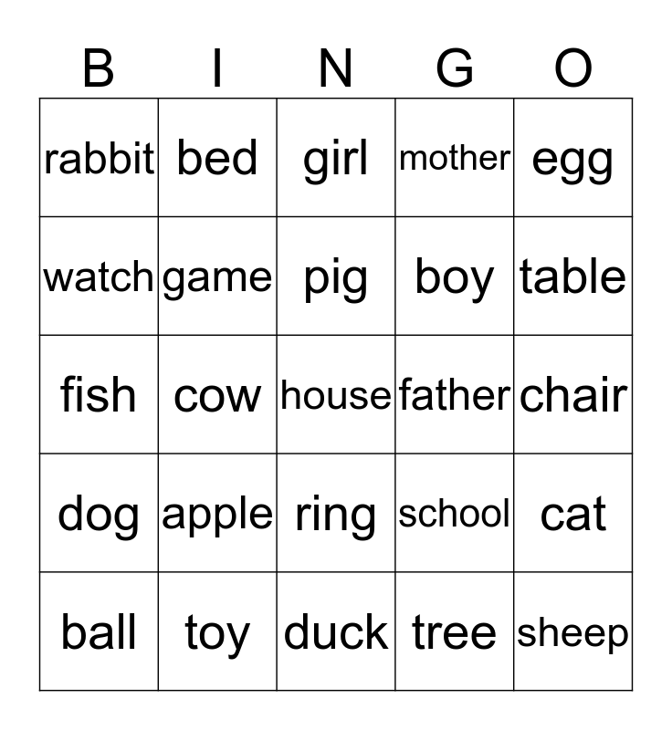 This bingo card has 25 words: apple, duck, pig, ball, egg, rabbit, watch, bed, father, ring, boy, fish, school, cat, game, sheep, chair, girl, table, cow, house, toy, dog, mother and tree.