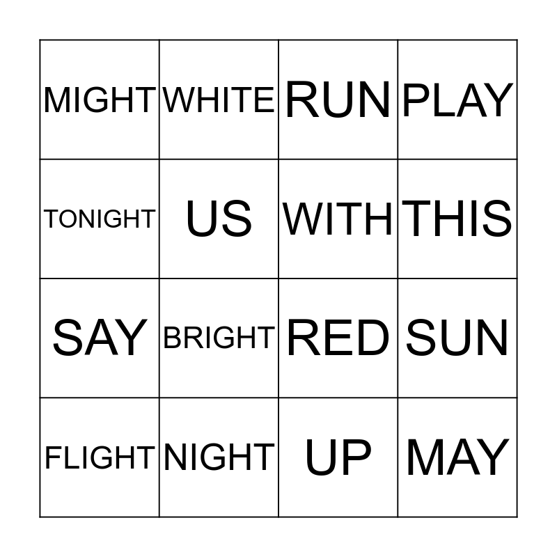 This bingo card has 16 words: NIGHT, SUN, RUN, MIGHT, SAY, WHITE, RED, UP, TONIGHT, US, FLIGHT, PLAY, BRIGHT, THIS, WITH and MAY.
