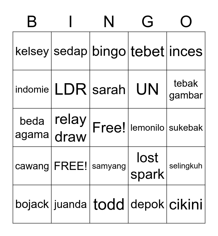 This bingo card has a free space and 25 words: FREE!, todd, sarah, bojack, inces, kelsey, indomie, sedap, lemonilo, samyang, UN, beda agama, lost spark, selingkuh, LDR, samkat, sukebak, bingo, tebak gambar, relay draw, cikini, juanda, cawang, tebet and depok.