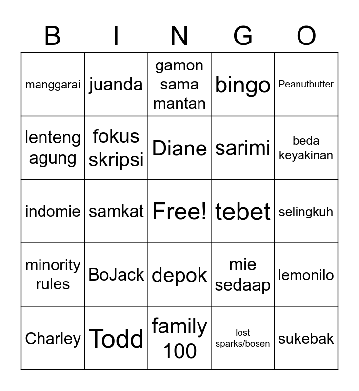 This bingo card has a free space and 24 words: BoJack, Todd, Diane, Charley, Peanutbutter, manggarai, lenteng agung, juanda, tebet, depok, sarimi, indomie, mie sedaap, lemonilo, fokus skripsi, lost sparks/bosen, selingkuh, gamon sama mantan, beda keyakinan, samkat, sukebak, minority rules, bingo and family 100.