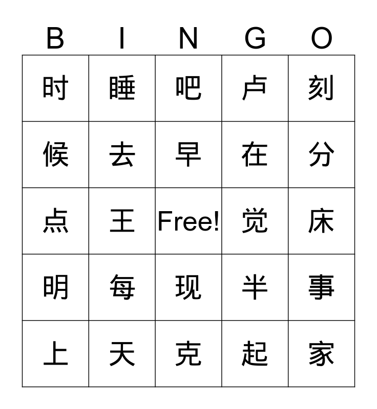 This bingo card has a free space and 24 words: 每, 天, 早, 上, 刻, 时, 候, 睡, 觉, 现, 在, 点, 半, 事, 去, 起, 床, 吧, 分, 王, 家, 明, 卢 and 克.