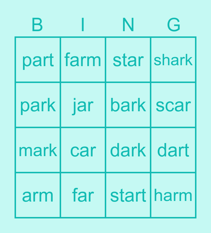 This bingo card has 22 words: far, chart, farm, smart, jar, bark, part, star, dark, harm, mark, shark, spark, bar, start, charm, dart, arm, car, park, scar and cart.