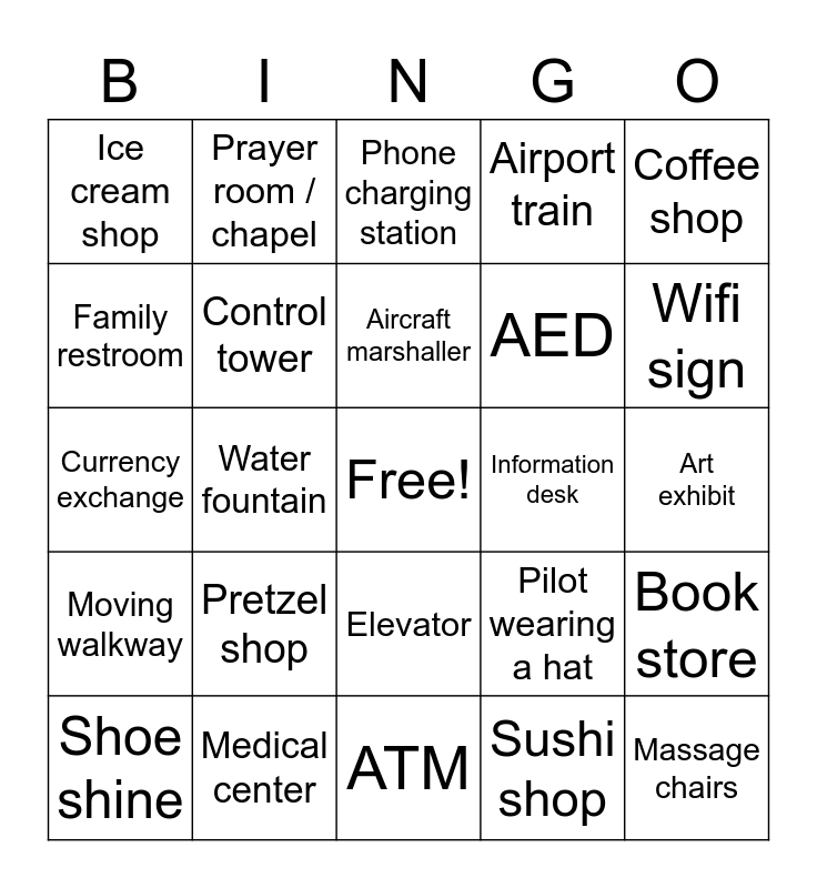 This bingo card has a free space and 27 words: Pilot wearing a hat, Security K9, AED, ATM, Family restroom, Phone charging station, Prayer room / chapel, Moving walkway, Information desk, Book store, Currency exchange, Airport train, Shoe shine, Medical center, Wifi sign, Recycling bin, Control tower, Aircraft marshaller, Pretzel shop, Ice cream shop, Art exhibit, Sushi shop, Water fountain, Massage chairs, Elevator, Coffee shop and Fire extinguisher.