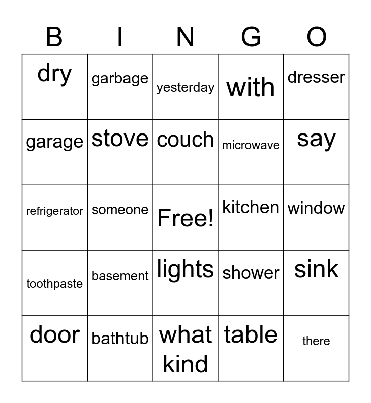 This bingo card has a free space and 24 words: basement, bathtub, couch, door, dresser, dry, garage, garbage, kitchen, lights, microwave, refrigerator, shower, sink, stove, table, window, yesterday, say, someone, there, toothpaste, with and what kind.