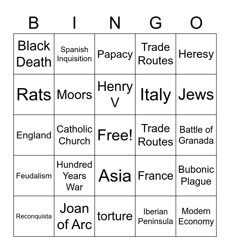 This bingo card has a free space and 24 words: Hundred Years War, Joan of Arc, Henry V, Reconquista, Heresy, Black Death, Rats, Spanish Inquisition, Trade Routes, Asia, Italy, England, France, Bubonic Plague, Moors, Iberian Peninsula, Battle of Granada, Papacy, Jews, Catholic Church, Modern Economy, Feudalism, Trade Routes and torture.