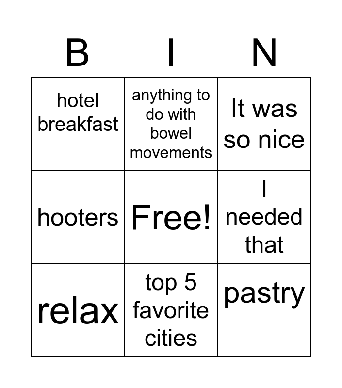 This bingo card has a free space and 8 words: I needed that, It was so nice, anything to do with bowel movements, relax, hotel breakfast, pastry, hooters and top 5 favorite cities.