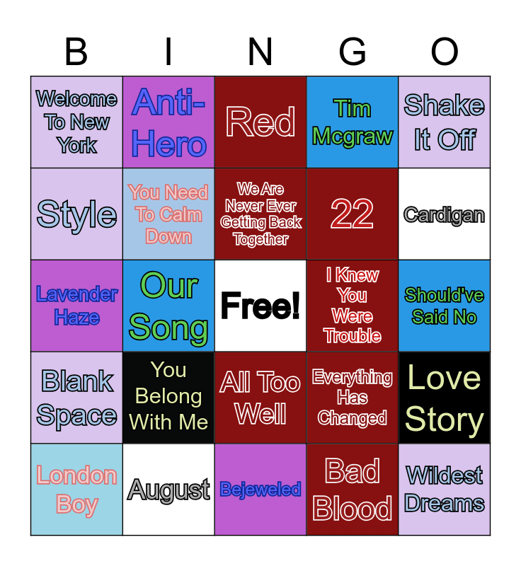 This bingo card has a free space and 24 words: You Belong With Me, August, We Are Never Ever Getting Back Together, London Boy, Shake It Off, Welcome To New York, Style, Anti-Hero, I Knew You Were Trouble, All Too Well, 22, Lavender Haze, Everything Has Changed, Love Story, You Need To Calm Down, Bad Blood, Should've Said No, Red, Cardigan, Our Song, Wildest Dreams, Blank Space, Tim Mcgraw and Bejeweled.