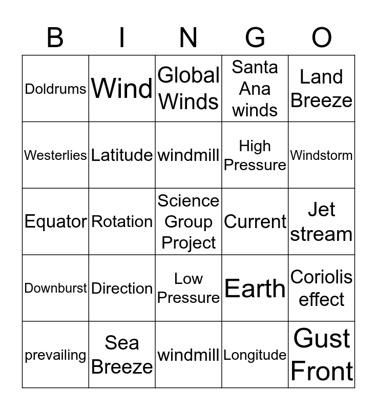 Wind Bingo | Wind Bingo | WINDS and CURRENTS | Bingo | Atmosphere and Weather Bingo