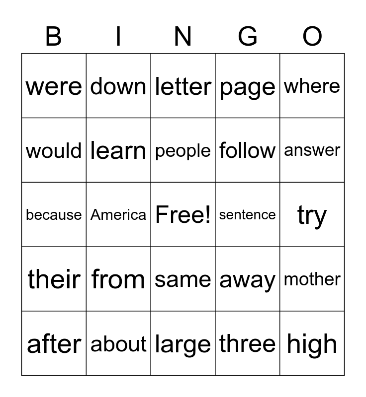 This bingo card has a free space and 24 words: from, about, people, after, where, were, would, down, sentence, same, follow, because, away, mother, learn, three, try, letter, answer, America, high, their, page and large.