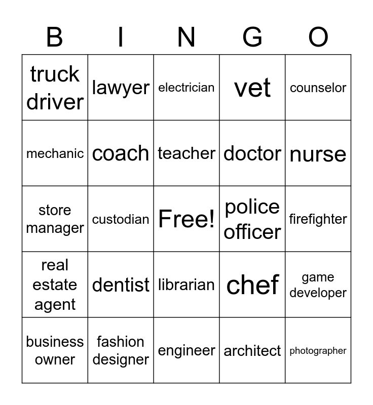 This bingo card has a free space and 24 words: dentist, fashion designer, teacher, business owner, counselor, truck driver, mechanic, lawyer, police officer, librarian, doctor, store manager, chef, game developer, coach, architect, firefighter, electrician, nurse, custodian, photographer, real estate agent, vet and engineer.