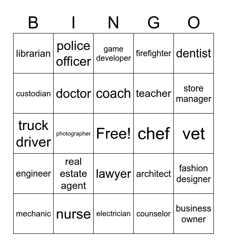 This bingo card has a free space and 24 words: real estate agent, nurse, coach, mechanic, dentist, librarian, custodian, police officer, chef, lawyer, teacher, truck driver, architect, fashion designer, doctor, counselor, vet, game developer, store manager, photographer, business owner, engineer, firefighter and electrician.
