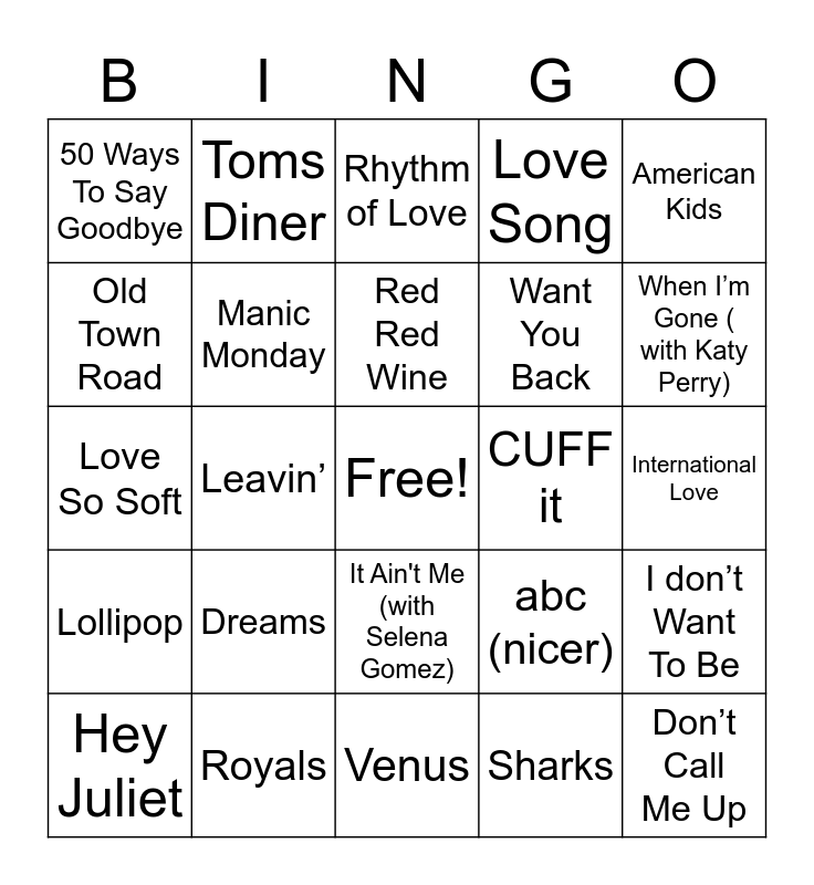 This bingo card has a free space and 69 words: Beauty and The Beat, International Love, Down, Me And Julio down By the Schoolyard, Royals, Halo, Love Song, A Thousand Miles, American Kids, Misery, I don’t Want To Be, Brighter Than The Sun, 50 Ways To Say Goodbye, Rhythm of Love, Mean, Leavin’, It Ain't Me (with Selena Gomez), Want You Back, CANT STOP THE FEELING!, Lollipop, CUFF it, abc (nicer), When I’m Gone ( with Katy Perry), Where Are you Now, Nonsense, Bones, Giddy Up, Numb, Sharks, Tightrope, Toms Diner, Ex’s & Oh’s, We are Young, Temperature, It’s not right but it’s okay, Lovebug, Hooked On A Feeling, Lips Are Moving, Old Town Road, Circles, Dreams, Don’t Call Me Up, Don’t Start Now, Shake it Off, Run This World ( Girls), Hey Juliet, Break Free, Take Me Home Tonight!/Be my Baby, Goody Two shoes, Manic Monday, Red Red Wine, That’s Not My Name, Another One Bites The Dust, Venus, Funky Town, Loco in Acapulco, Maneater, Don’t You ( Forget About me ), Handclap, Love So Soft, Gunpowder & Lead, Afternoon Delight, She Thinks My Tractor's Sexy, When the Sun Goes Down, Boot Scootin’ Boogie, Chicken Fried, Rock Lobster, Born to Run and Hit Me With your Best Shot.