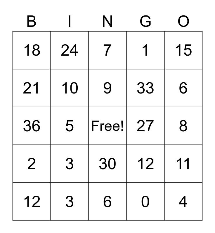 This bingo card has a free space and 25 words: 3, 6, 9, 12, 15, 18, 21, 24, 27, 30, 33, 36, 12, 11, 10, 9, 8, 7, 6, 5, 4, 3, 2, 1 and 0.