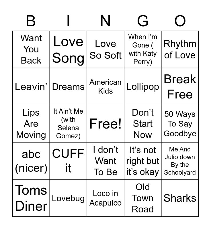This bingo card has a free space and 65 words: Beauty and The Beat, International Love, Down, Me And Julio down By the Schoolyard, Royals, Halo, Love Song, A Thousand Miles, American Kids, Misery, I don’t Want To Be, Brighter Than The Sun, 50 Ways To Say Goodbye, Rhythm of Love, Mean, Leavin’, It Ain't Me (with Selena Gomez), Want You Back, CANT STOP THE FEELING!, Lollipop, CUFF it, abc (nicer), When I’m Gone ( with Katy Perry), Where Are you Now, Nonsense, Bones, Giddy Up, Numb, Sharks, Tightrope, Toms Diner, Ex’s & Oh’s, We are Young, Temperature, It’s not right but it’s okay, Lovebug, Hooked On A Feeling, Lips Are Moving, Old Town Road, Circles, Dreams, Don’t Call Me Up, Don’t Start Now, Shake it Off, Run This World ( Girls), Hey Juliet, Break Free, Take Me Home Tonight!/Be my Baby, Goody Two shoes, That’s Not My Name, Another One Bites The Dust, Venus, Funky Town, Loco in Acapulco, Maneater, Don’t You ( Forget About me ), Handclap, Love So Soft, Gunpowder & Lead, Afternoon Delight, She Thinks My Tractor's Sexy, When the Sun Goes Down, Boot Scootin’ Boogie, Born to Run and Hit Me With your Best Shot.