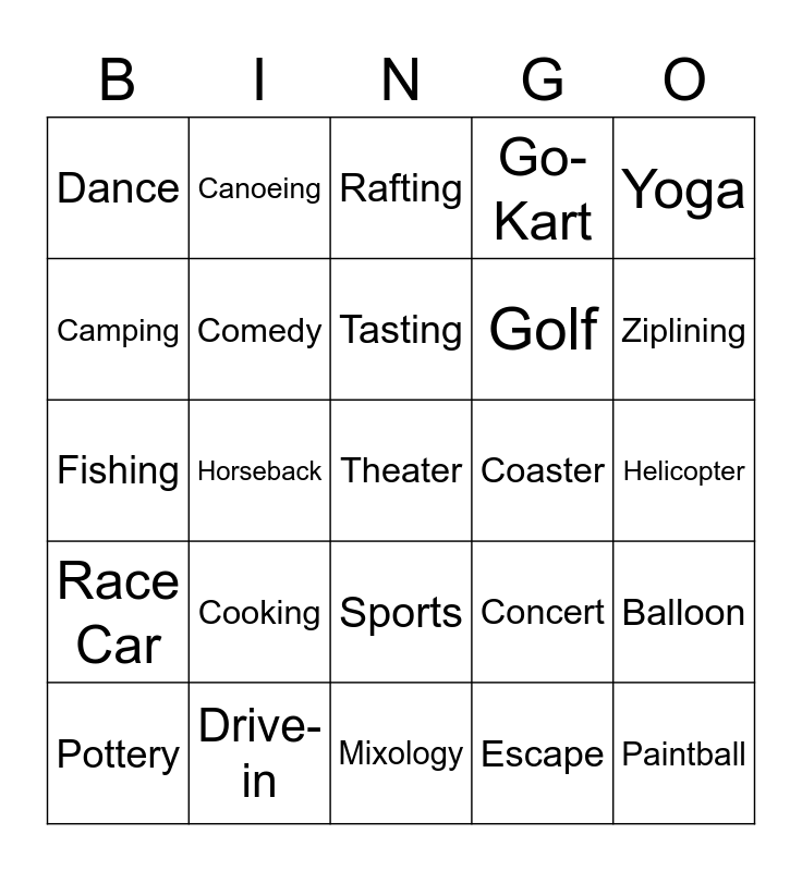This bingo card has 25 words: Cooking, Mixology, Tasting, Pottery, Yoga, Dance, Camping, Canoeing, Coaster, Sports, Golf, Fishing, Concert, Balloon, Comedy, Paintball, Helicopter, Rafting, Ziplining, Horseback, Theater, Drive-in, Race Car, Go-Kart and Escape.
