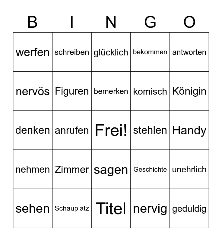 This bingo card has a free space and 28 words: unehrlich, ungeduldig, komisch, nervig, nervös, glücklich, schreiben, nehmen, stehlen, sehen, denken, bekommen, Schauplatz, Titel, Königin, Wahrheit, Zimmer, Figuren, bemerken, sagen, werfen, ehrlich, geduldig, anrufen, Handy, Geschichte, antworten and gewinnen.