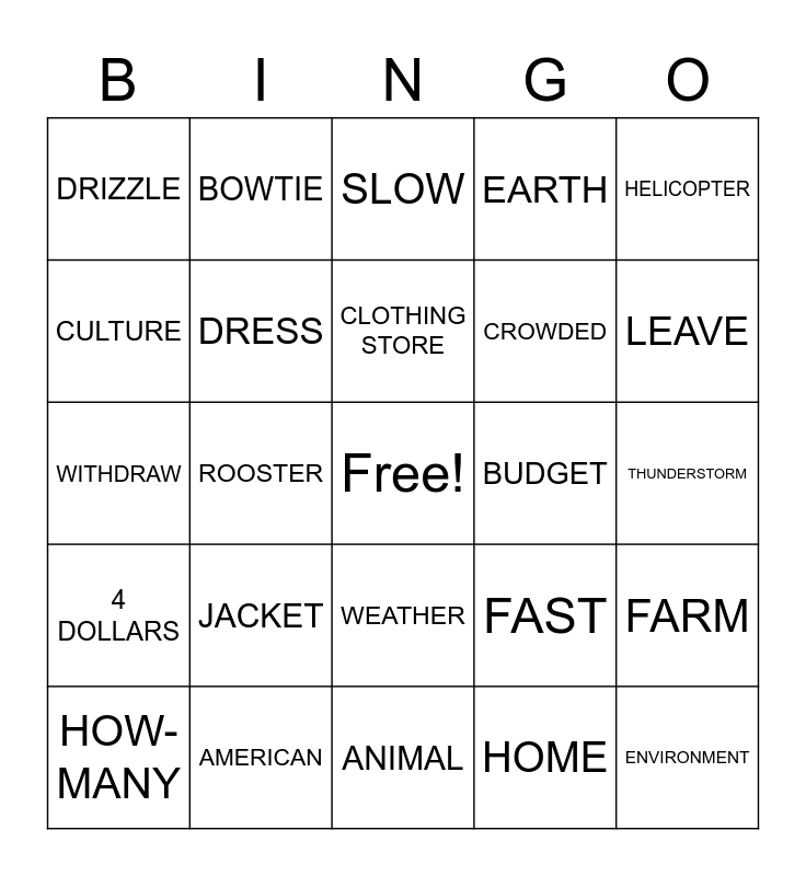 This bingo card has a free space and 34 words: BUY, HOME, BOOKSHELF, SHOWER, 4 DOLLARS, DRESS, HELICOPTER, HOW-MANY, BOWTIE, WORK, CLOTHING STORE, SLOW, COMFORTABLE, TRAVEL, BUDGET, LEAVE, AMERICAN, WITHDRAW, JACKET, FAST, WEATHER, SPRING, DRIZZLE, THUNDERSTORM, ANIMAL, ENVIRONMENT, EARTH, RIVER, CROWDED, CULTURE, LANGUAGE, ROOSTER, FARM and COUNTRY.