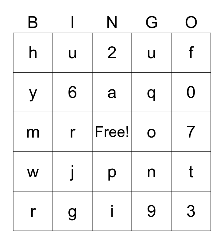 This bingo card has a free space and 24 words: j, g, a, r, f, h, y, u, o, p, q, m, n, t, 6, 9, 7, 2, 0, r, 3, w, u and i.