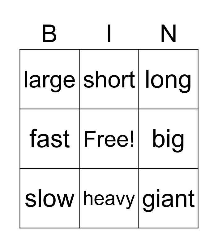 This bingo card has a free space and 12 words: small, tiny, giant, big, short, long, heavy, light, large, fast, slow and little.