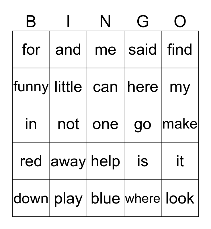 This bingo card has 25 words: away, blue, can, down, find, for, funny, and, go, help, here, in, is, it, little, look, make, me, my, not, one, play, red, said and where.