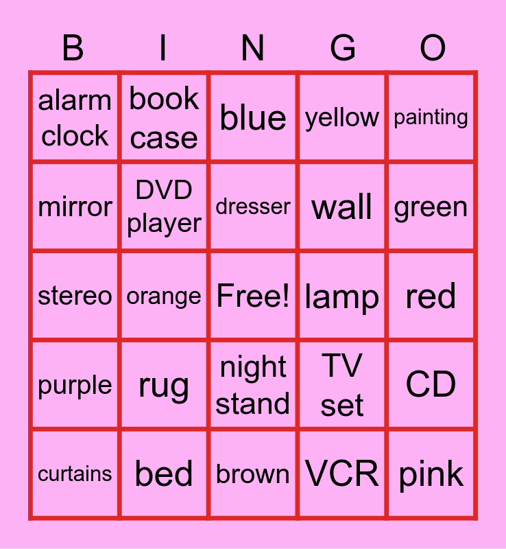 This bingo card has a free space and 24 words: rug, bed, dresser, curtains, painting, alarm clock, mirror, book case, lamp, night stand, wall, stereo, TV set, CD, DVD player, VCR, red, blue, green, orange, pink, purple, yellow and brown.