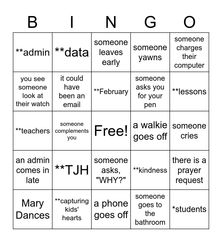 This bingo card has a free space and 29 words: Mary Dances, someone digs in their purse/bag, someone complements you, someone sneezes, **admin, someone leaves early, it could have been an email, **TJH, a walkie goes off, **capturing kids' hearts, someone cries, *students, a phone goes off, someone goes to the bathroom, **lessons, **exploratory, someone asks, "WHY?", an admin comes in late, someone charges their computer, **teachers, **kindness, someone complements you, someone asks you for your pen, you see someone look at their watch, someone yawns, **data, there is a prayer request, **February and someone repeats something you missed the speaker say.