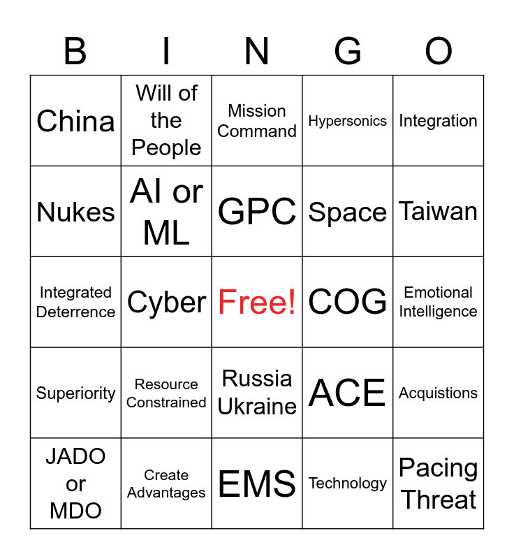 This bingo card has a free space and 29 words: JADO or MDO, Accelerate Change, Cyber, Whole of Govt, China, Mission Command, AI or ML, Resource Constrained, COG, Create Advantages, Emotional Intelligence, Pacing Threat, EMS, Technology, Taiwan, National Defense Strategy, Russia Ukraine, Superiority, Integration, Integrated Deterrence, ACE, Kill Web, Space, Nukes, Hypersonics, Will of the People, Acquistions, GPC and Domain.