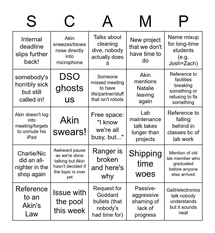 This bingo card has a free space and 43 words: "We need to get [this project we're all working overtime on] done by [deadline we all know]", Galil/electronics talk nobody understands but it sounds neat, Akin forgets software again, Reference to an Akin's Law, Akin appears to be asleep, Passive-aggressive shaming of lack of progress, Talks about cleaning dive, nobody actually does it, Relevant undergrad mysteriously absent, Name mixup for long-time students (e.g. Josh=Zach), Issue with the pool this week, New project that we don't have time to do, Lab maintenance talk takes longer than projects, Ranger is broken and here's why, Awkward pause as we're done talking but Akin hasn't decided if the topic is over yet, New undergrad abandons project, Request for Goddard bullets (that nobody's had time for), Josh references ETH Zurich, Akin doesn't log into meeting/forgets to unmute his iPad, Someone names a random part number that they absolutely should not know from memory, Reference to facilities breaking something or refusing to fix something, Akin sneezes/blows nose directly into microphone, Goddard ghosts us on what they want from us, Important tool/manufacturing equipment broken at critical time, Internal deadline slips further back!, Reference to/request for no-cost extension, Reference to falling behind in classes bc of lab work, Someone jumps from the loud squeaking from the ventilation in the meeting room, ML/neural network joke, Shipping time woes, Charlie/Nic did an all-nighter in the shop again, Storytime with Dave!, Mention of old lab member who graduated before anyone else arrived, Mysterious cross-project reallocation of $$$, Akin swears!, Misattribution of work to somebody else, Akin traveling, Someone working even while """on vacation""", Someone missed meeting to have life/partner/stuff that isn't robots, somebody's horribly sick but still called in!, Akin mentions Natalie leaving again, "How much money does this project have left?", DSO ghosts us and Rahul is too good at software.