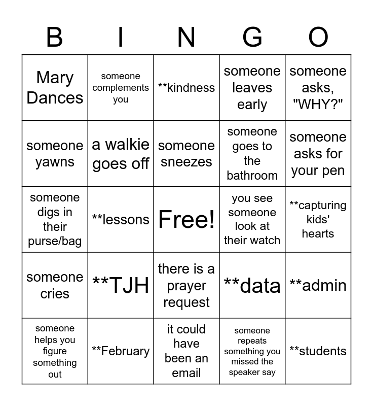 This bingo card has a free space and 29 words: someone helps you figure something out, **exploratory, **lessons, an admin comes in late, Mary Dances, **kindness, a walkie goes off, **TJH, you see someone look at their watch, **February, **capturing kids' hearts, **students, it could have been an email, someone repeats something you missed the speaker say, someone asks for your pen, a phone goes off, there is a prayer request, someone cries, someone asks, "WHY?", someone digs in their purse/bag, **data, someone charges their computer, someone goes to the bathroom, someone yawns, someone leaves early, someone complements you, **admin, someone sneezes and **teachers.