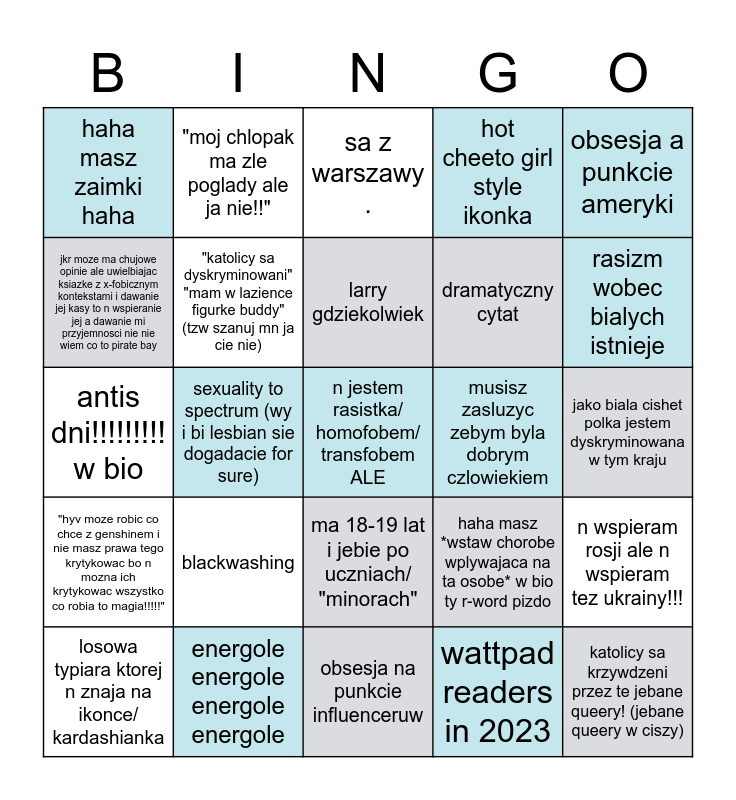 This bingo card has a free space and 24 words: blackwashing, energole energole energole energole, larry gdziekolwiek, losowa typiara ktorej n znaja na ikonce/ kardashianka, obsesja a punkcie ameryki, haha masz zaimki haha, jkr moze ma chujowe opinie ale uwielbiajac ksiazke z x-fobicznym kontekstami i dawanie jej kasy to n wspieranie jej a dawanie mi przyjemnosci nie nie wiem co to pirate bay, "moj chlopak ma zle poglady ale ja nie!!", musisz zasluzyc zebym byla dobrym czlowiekiem, ma 18-19 lat i jebie po uczniach/ "minorach", dramatyczny cytat, antis dni!!!!!!!!! w bio, haha masz *wstaw chorobe wplywajaca na ta osobe* w bio ty r-word pizdo, n wspieram rosji ale n wspieram tez ukrainy!!!, "katolicy sa dyskryminowani" "mam w lazience figurke buddy" (tzw szanuj mn ja cie nie), wattpad readers in 2023, jako biala cishet polka jestem dyskryminowana w tym kraju, sa z warszawy ., rasizm wobec bialych istnieje, sexuality to spectrum (wy i bi lesbian sie dogadacie for sure), katolicy sa krzywdzeni przez te jebane queery! (jebane queery w ciszy), "hyv moze robic co chce z genshinem i nie masz prawa tego krytykowac bo n mozna ich krytykowac wszystko co robia to magia!!!!!", hot cheeto girl style ikonka and obsesja na punkcie influenceruw.
