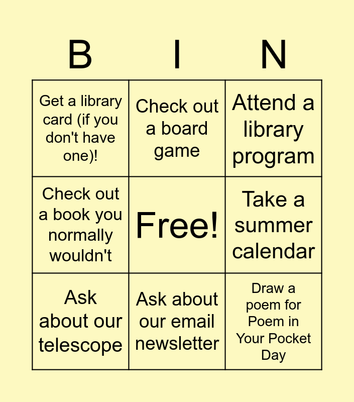 This bingo card has a free space and 8 words: Take a summer calendar, Attend a library program, Check out a board game, Ask about our telescope, Get a library card (if you don't have one)!, Draw a poem for Poem in Your Pocket Day, Check out a book you normally wouldn't and Ask about our email newsletter.