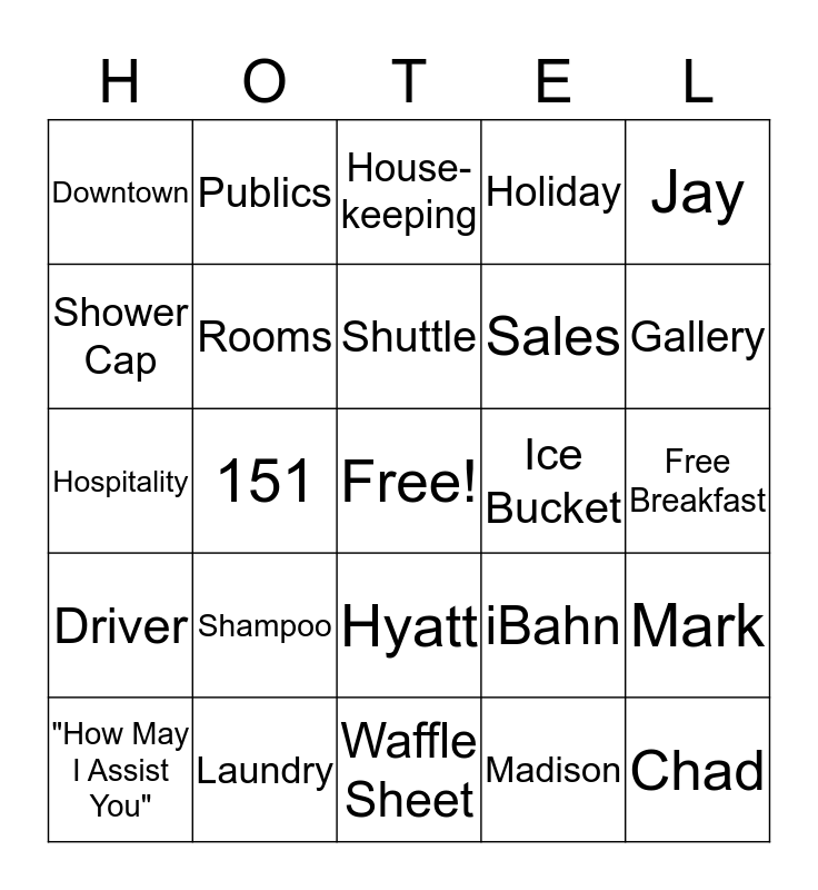 This bingo card has a free space and 24 words: Shampoo, Laundry, Shuttle, "How May I Assist You", Jay, Downtown, Shower Cap, Publics, Ice Bucket, Hyatt, Sales, Hospitality, iBahn, Mark, Rooms, Madison, Free Breakfast, House- keeping, Gallery, 151, Chad, Driver, Holiday and Waffle Sheet.
