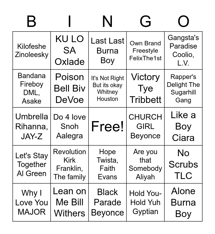 This bingo card has a free space and 78 words: Percolator Cajmere, Feeling good Nina Simone, Last Last Burna Boy, Bless The Lord (Son of Man) Tye Tribbett, Weak SWV, Rapper's Delight The Sugarhill Gang, Won Da mo Mavins, Black Parade Beyonce, Crank that Soulja Boy, Why I Love You MAJOR, CHURCH GIRL Beyonce, Shen Yeng Anthem Sheneseea, Own Brand Freestyle FelixThe1st, Kilofeshe Zinoleesky, Alone Burna Boy, Bandana Fireboy DML, Asake, Just wanna Rock Lil Uzi Vert, Revolution Kirk Franklin, The family, Toast Koffee, Like a Boy Ciara, KU LO SA Oxlade, Gangsta's Paradise Coolio, L.V., Umbrella Rihanna, JAY-Z, It's Not Right But its okay Whitney Houston, Poison Bell Biv DeVoe, Percolator Cajmere, Feeling good Nina Simone, Last Last Burna Boy, Bless The Lord (Son of Man) Tye Tribbett, Weak SWV, Rapper's Delight The Sugarhill Gang, Won Da mo Mavins, Black Parade Beyonce, Crank that Soulja Boy, Why I Love You MAJOR, CHURCH GIRL Beyonce, Shen Yeng Anthem Sheneseea, Own Brand Freestyle FelixThe1st, Kilofeshe Zinoleesky, Alone Burna Boy, Bandana Fireboy DML, Asake, Just wanna Rock Lil Uzi Vert, Revolution Kirk Franklin, The family, Toast Koffee, Like a Boy Ciara, KU LO SA Oxlade, Gangsta's Paradise Coolio, L.V., Umbrella Rihanna, JAY-Z, It's Not Right But its okay Whitney Houston, Poison Bell Biv DeVoe, No Scrubs TLC, Do 4 love Snoh Aalegra, Are you that Somebody Aliyah, Boo'd up Ella Mai, Cupid Shuffle Cupid, Boogie Wonderland, Empire State of Mind JAY-Z, Alicia Keys, Ain't Nobody Rufus, Chaka Khan, Midnight Train to Georgia Gladys Knight&The pips, Hope Twista, Faith Evans, Victory Tye Tribbett, Formation Beyonce, Best Love Song T-pain, Hey Ya! Outkast, At Last Etta James, Drop it Like it's Hot Snoop Dogg, Pharrell Williams, All my Life K-Ci&JoJO, Before I let Go Maze& Frankie Beverly, Let's Stay Together Al Green, Lean on Me Bill Withers, Pick Up your Feelings Jazmine Sullivan, Work it Missy Elliott, Supermodel (You better Work) RuPaul, Cover Girl RuPaul, Hold You-Hold Yuh Gyptian, Murder she Wrote Chaka Demus& Pliers, Fever Vybz Kartel and Heart Break Anniversary Giveon.